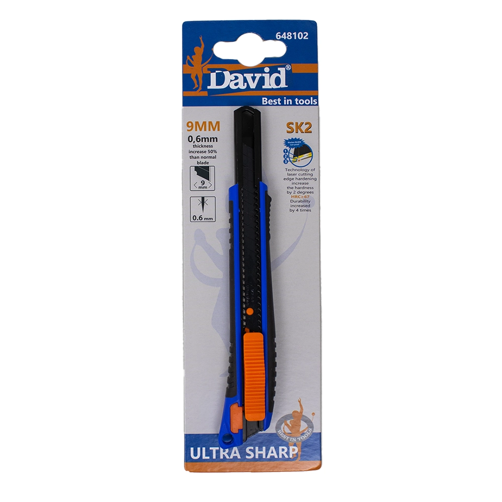 Das DAVID Messer ABS 9 mm SK2 ZB ist ideal für alle, die ein leistungsstarkes und sicheres Messer suchen. Dieses schwarze und blaue Messer hat eine Klinge, die 50 % dicker ist als ein normales Messer, was für mehr Widerstandsfähigkeit und Langlebigkeit sorgt.